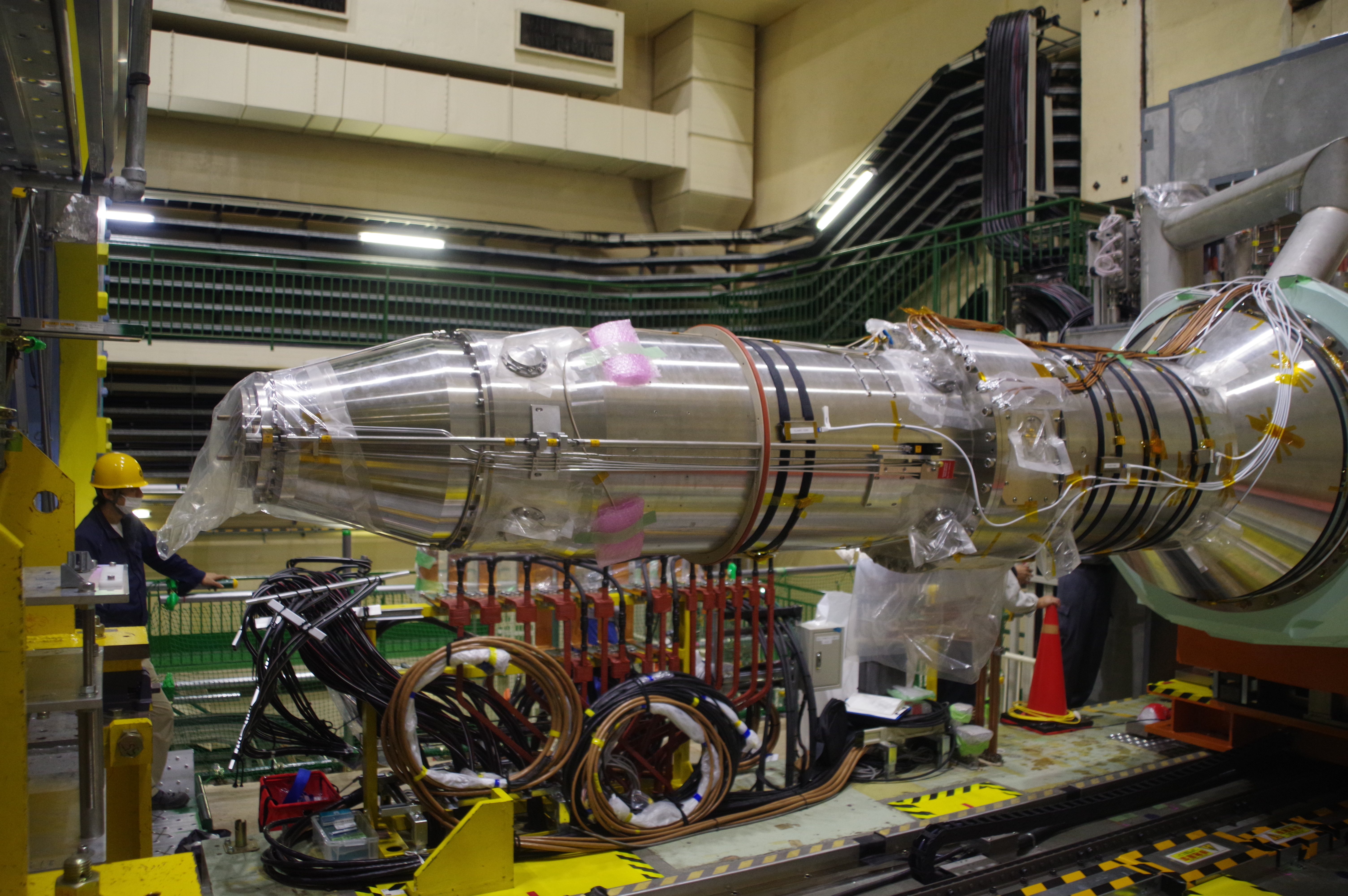SuperKEKBでは、電子と陽電子ビームの衝突性能(ルミノシテイ)をKEKBの数十倍まで向上させることを目標としています。この為に2つのビームは縦方向に陽電子/ 電子=48/62ナノメートルまで絞られます。これを実現する為に、衝突点の一番近い位置に沢山(色々な種類)の超伝導電磁石が設置されています。SuperKEKBでは、ビーム衝突点の左右にクライオスタットがKEKBと同じく1台づつ配置されていますが、各クライオスタットの中には超伝導4極電磁石が4台、超伝導ソレノイドが1台、超伝導コイルが20台組込まれています。